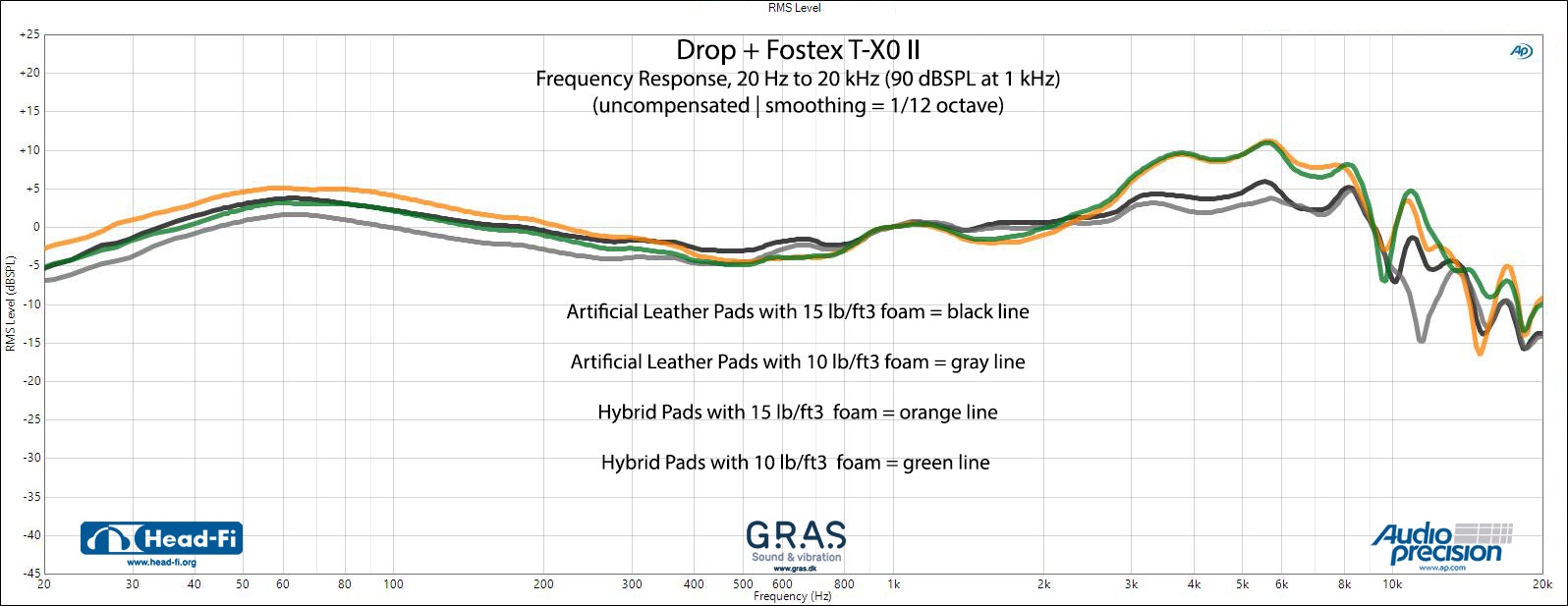 Swapping out the fake leather pads and 15 lb/ft3 density foam for the velour pads and 10 lb foam results in a totally different but refreshing sound. With mids and highs elevated and bass just a bit more dubdued, it’s an even richer and more-rewarding sound for vocal-heavy tracks. But this is just one variation on the sound. You can see frequency response charts for all four combinations here.
